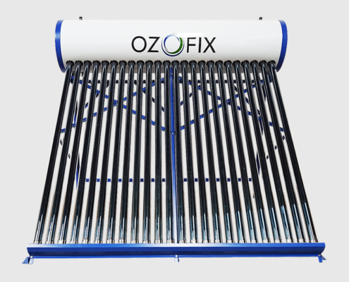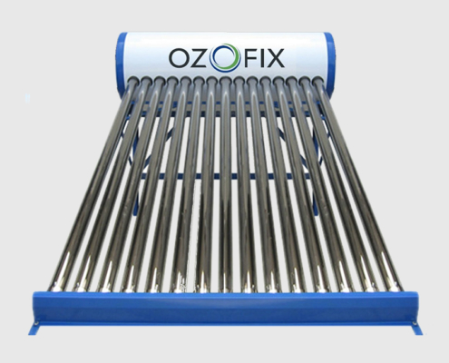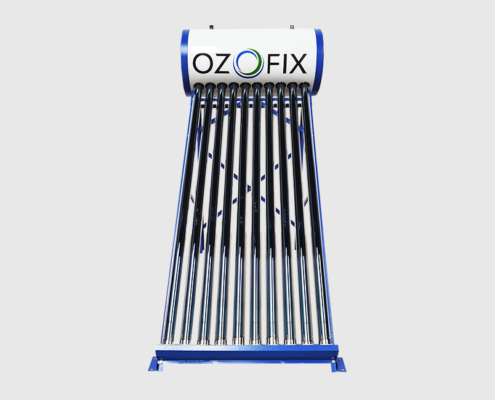 Los termotanques solares termosifónicos OZOFIX, son equipos económicos e ideales para instalaciones sanitarias no presurizadas. Funcionan mediante un proceso llamado termosifón. El agua fría ingresa al termotanque por gravedad desde un tanque de agua ubicado a mayor altura o con agua provista directamente de la red. A medida que el agua dentro de los tubos se calienta sube naturalmente y se almacena en el tanque del equipo. Este proceso es continuo mientras el colector capte la energía solar.
